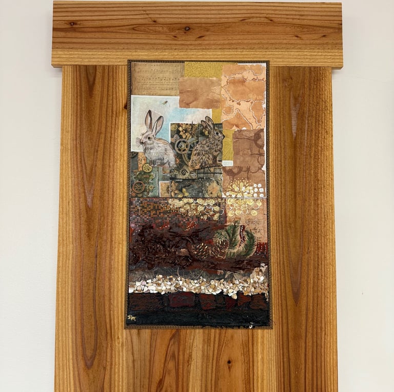 Two Hares is a celebration of friendship, mischief, and the unspoken bond that makes life sweeter. These two lively creatures embody the essence of partnership — sometimes playful, sometimes challenging, always deeply connected. Crafted with mixed media and finished with a custom rustic frame, this piece blends elegance with a touch of wild charm.